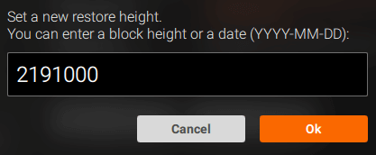 2) Next, enter your new restore height, which should be the number of the block in which your first incoming transaction was included. If you have the transaction ID (txid) of the first incoming transaction, you can enter it in a block explorer to check in which block it was included.