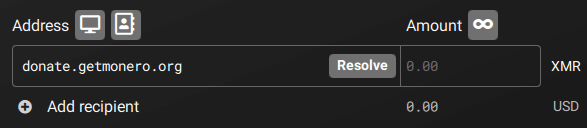 This field also supports OpenAlias addresses, which are human readable addresses (for instance, donate.getmonero.org). If you enter an OpenAlias address, a Resolve button will be displayed. Click on it to retrieve its Monero address.
