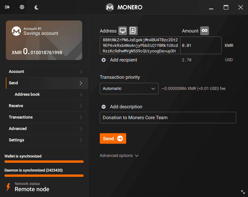5) If you are using Monero GUI in Advanced mode, you will see a Transaction priority dropbox. It's recommended to leave it on Automatic.